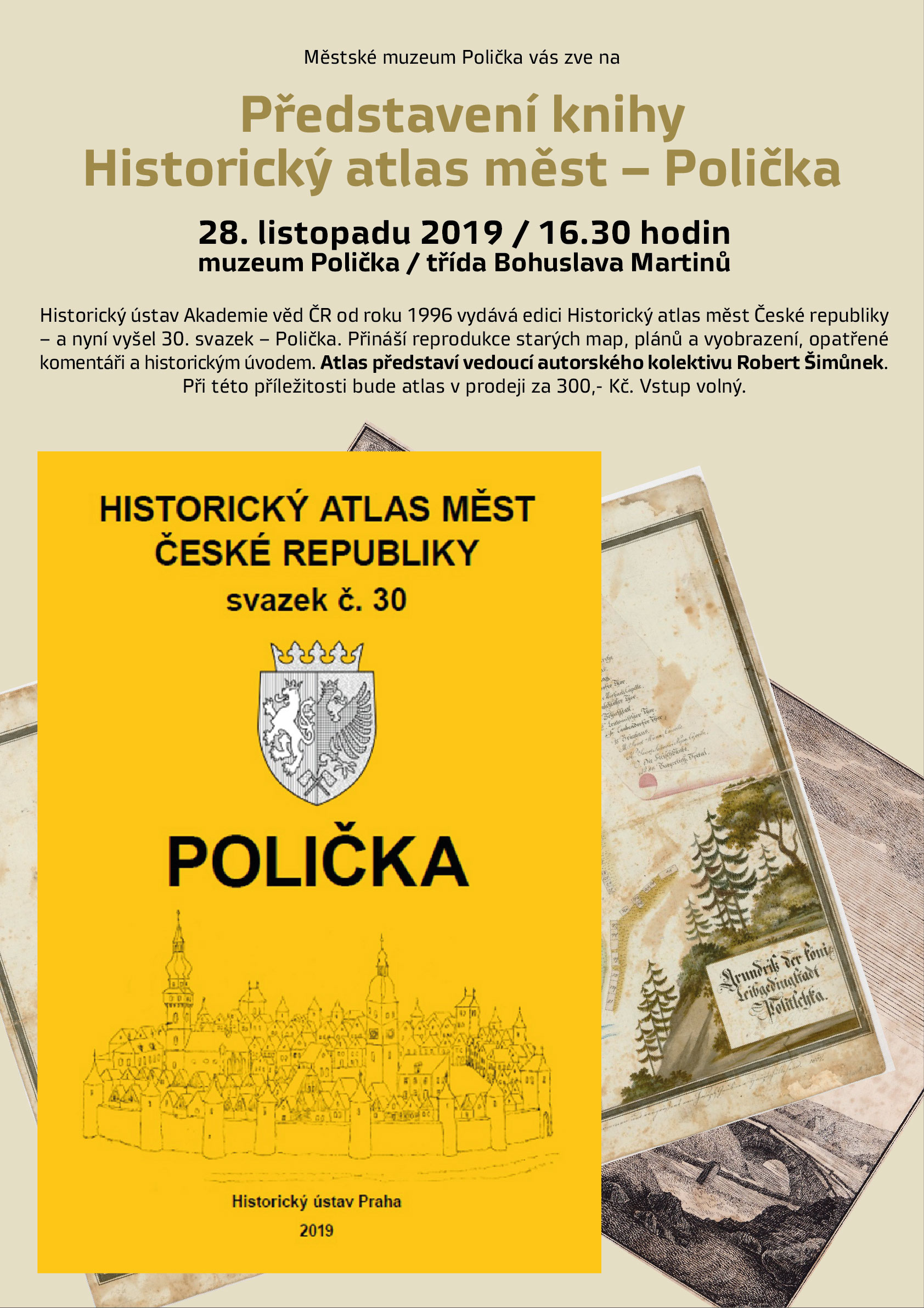Historický ústav Akademie věd ČR od roku 1996 vydává edici Historický atlas měst České republiky – a nyní vyšel 30. svazek – Polička. Přináší reprodukce starých map, plánů a vyobrazení, opatřené komentáři a historickým úvodem. Atlas představí vedoucí autorského kolektivu Robert Šimůnek. Při této příležitosti bude atlas v prodeji za 300,- Kč.